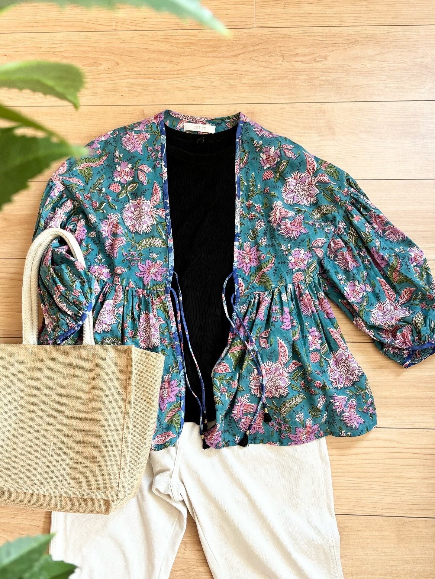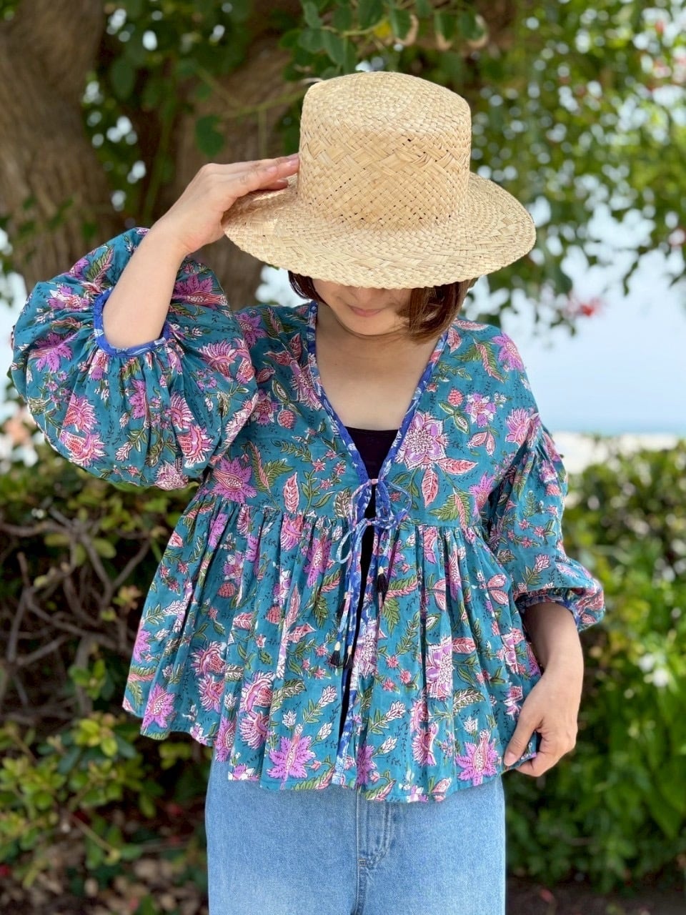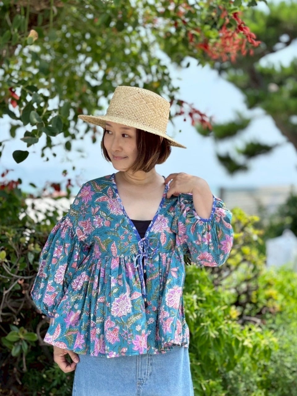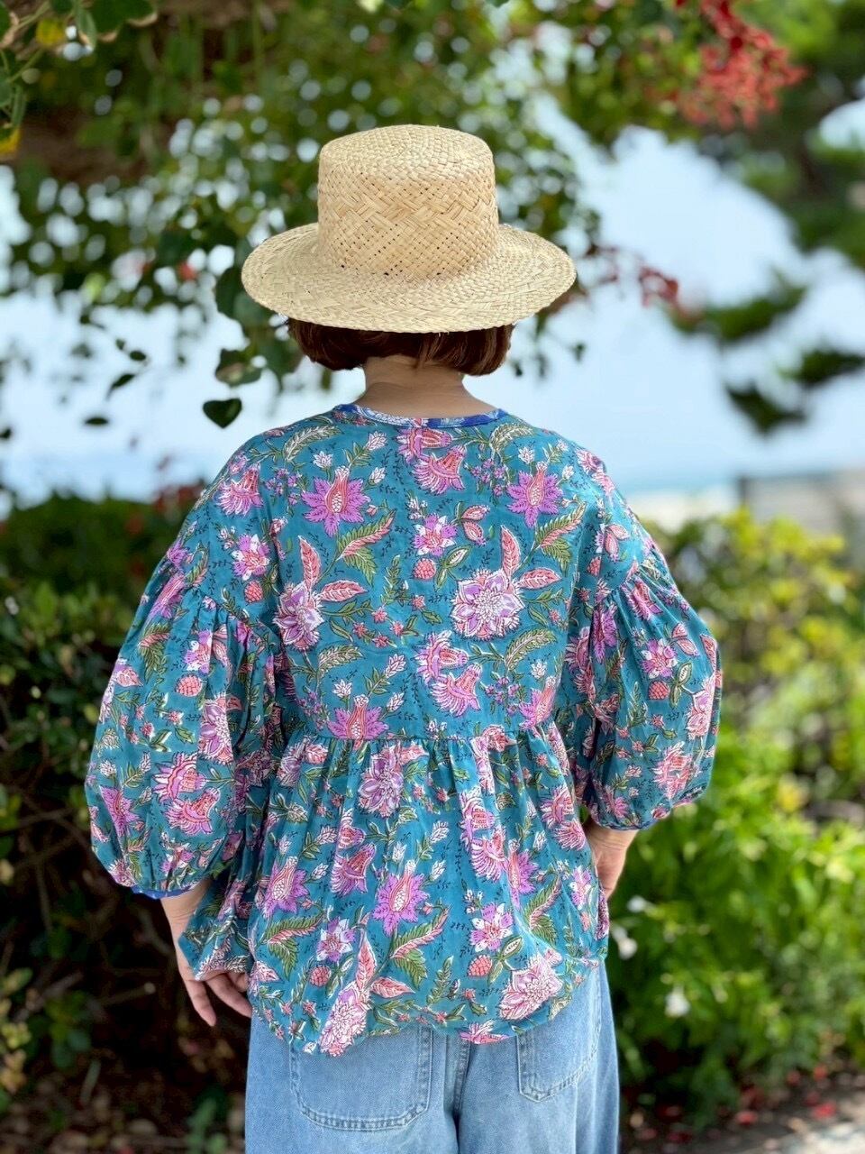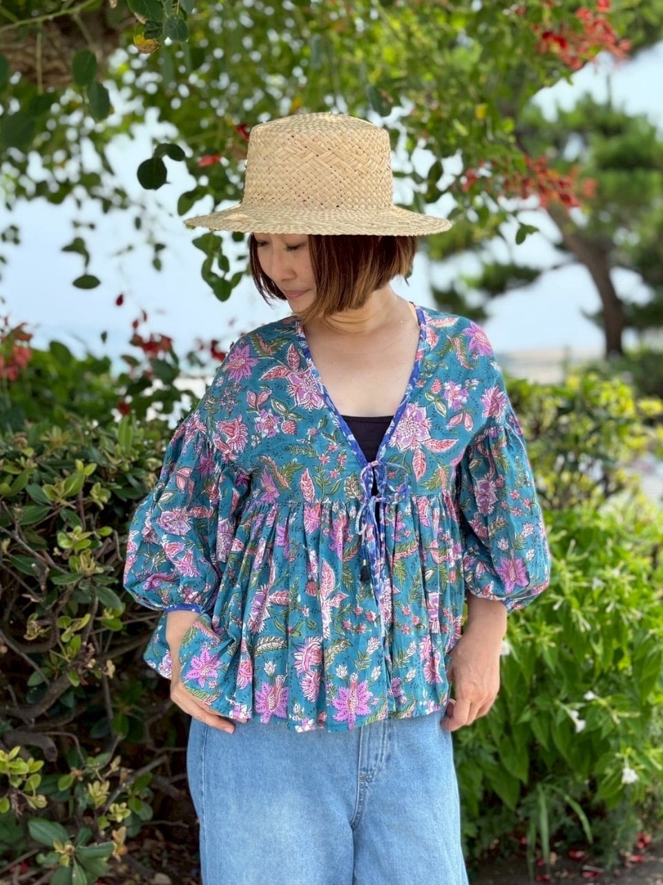 こちらのブラウスは、インドの職人が一つ一つ大きなスタンプを押して模様をつけたブロックプリント生地を贅沢に使用しています。