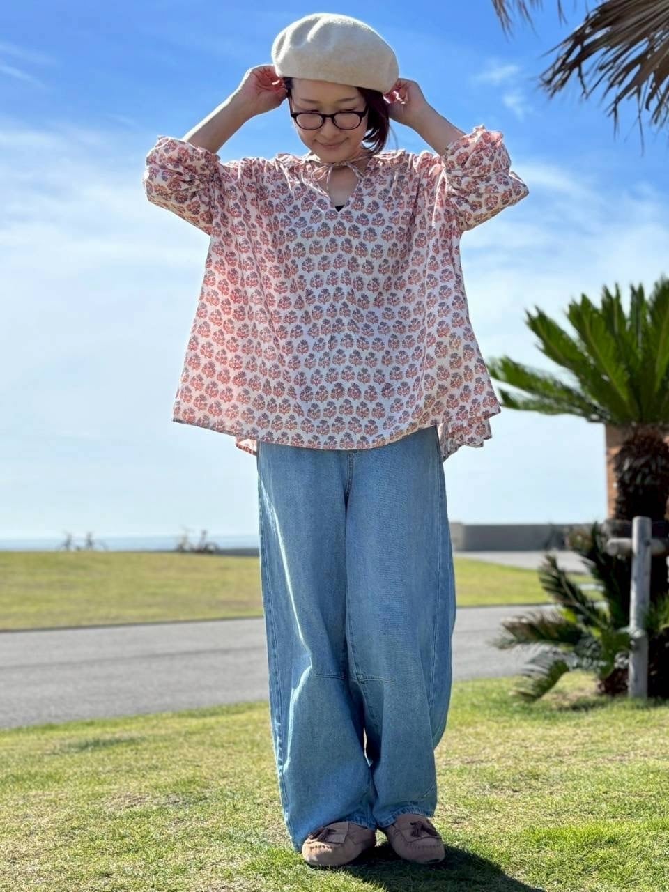 こちらのブラウスは、インドの職人が一つ一つ大きなスタンプを押して模様をつけたブロックプリント生地を贅沢に使用しています。
