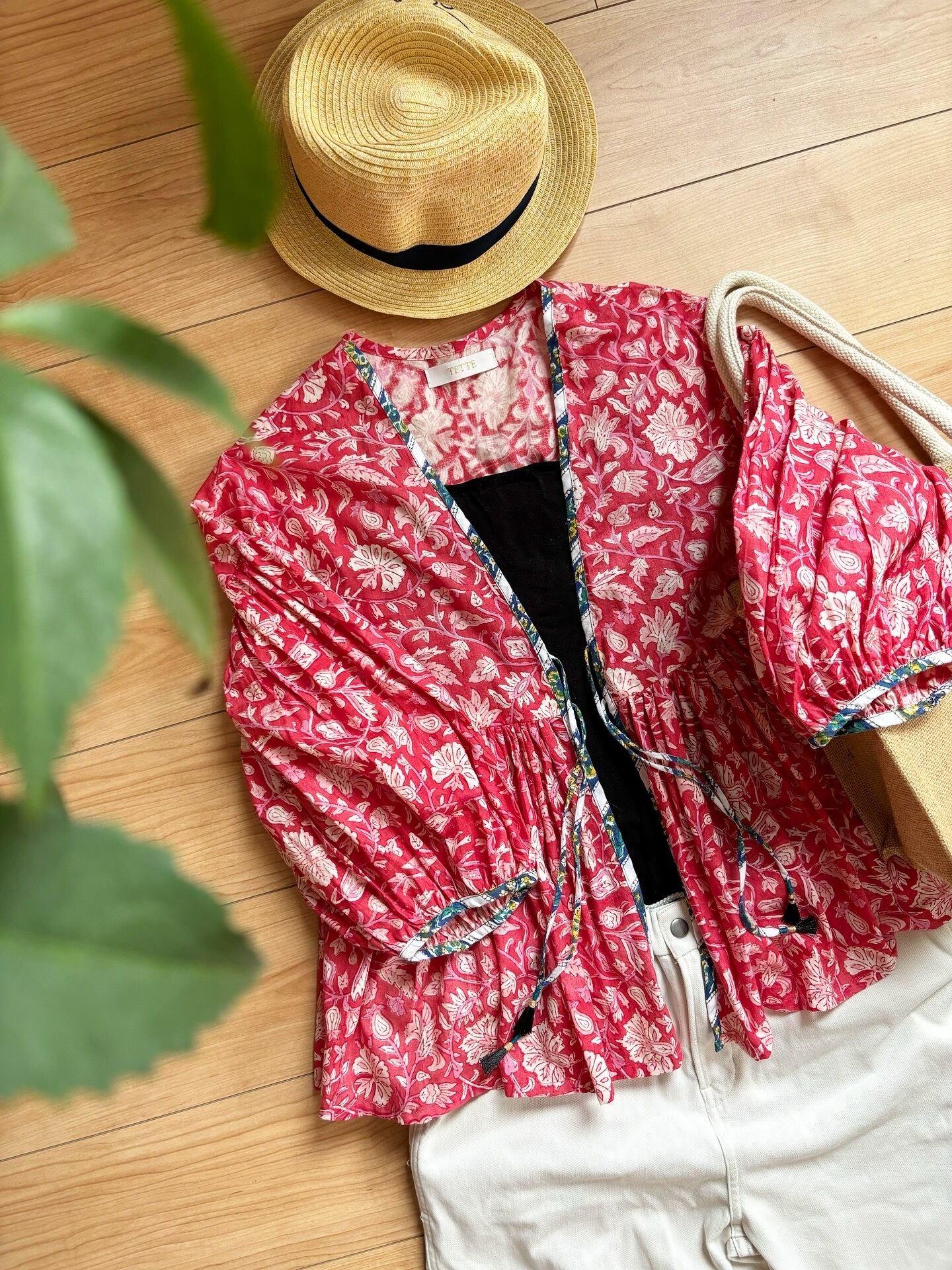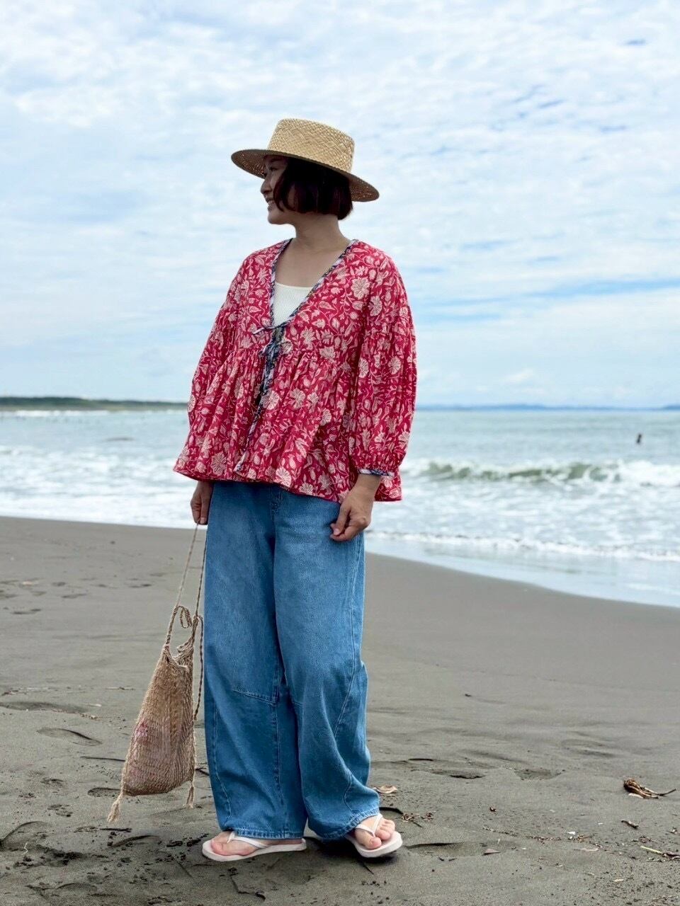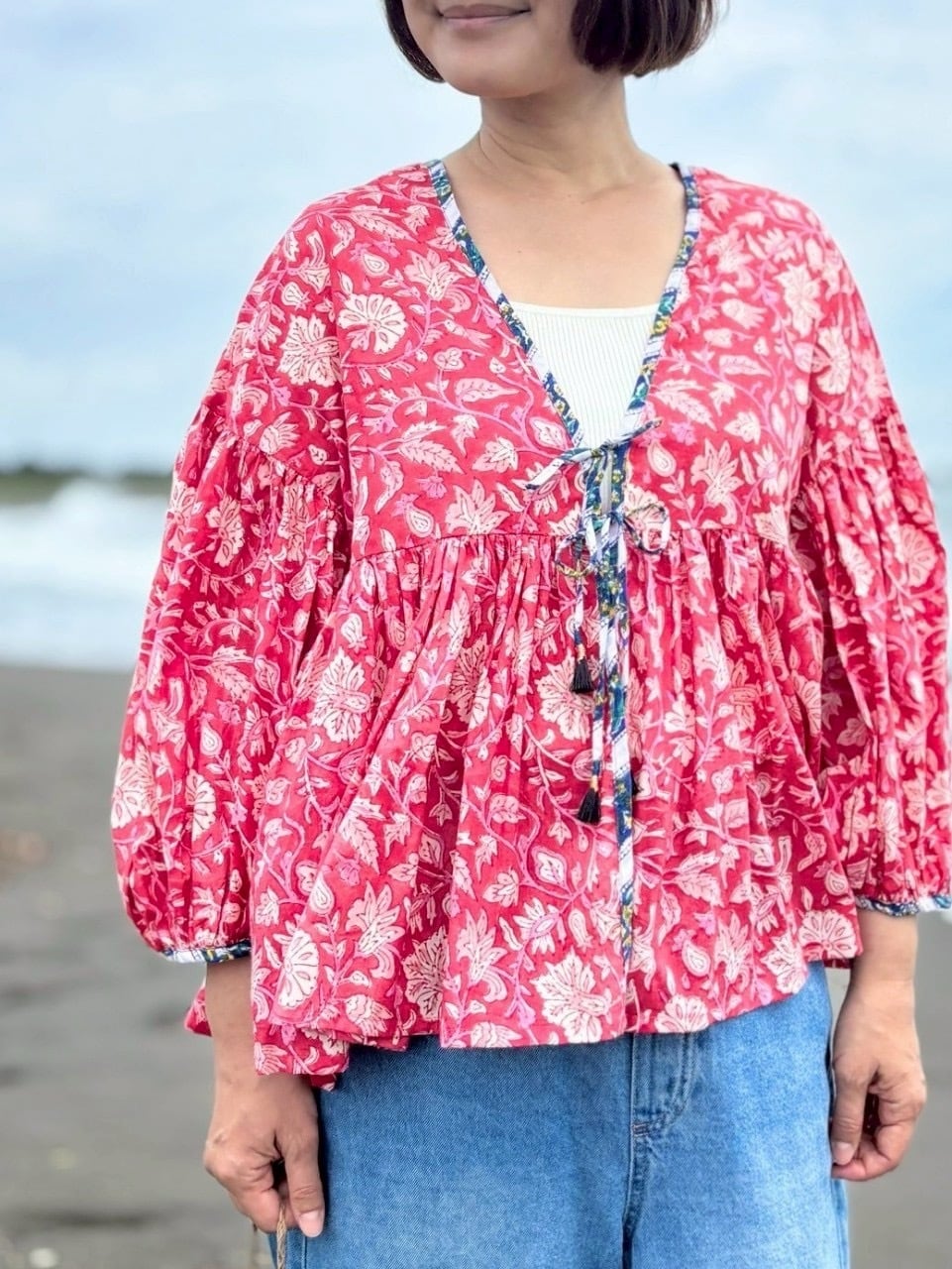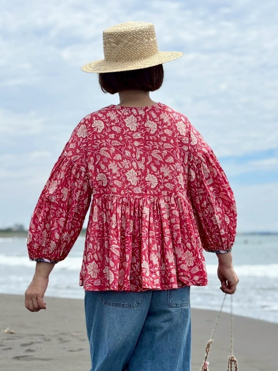 こちらのブラウスは、インドの職人が一つ一つ大きなスタンプを押して模様をつけたブロックプリント生地を贅沢に使用しています。
