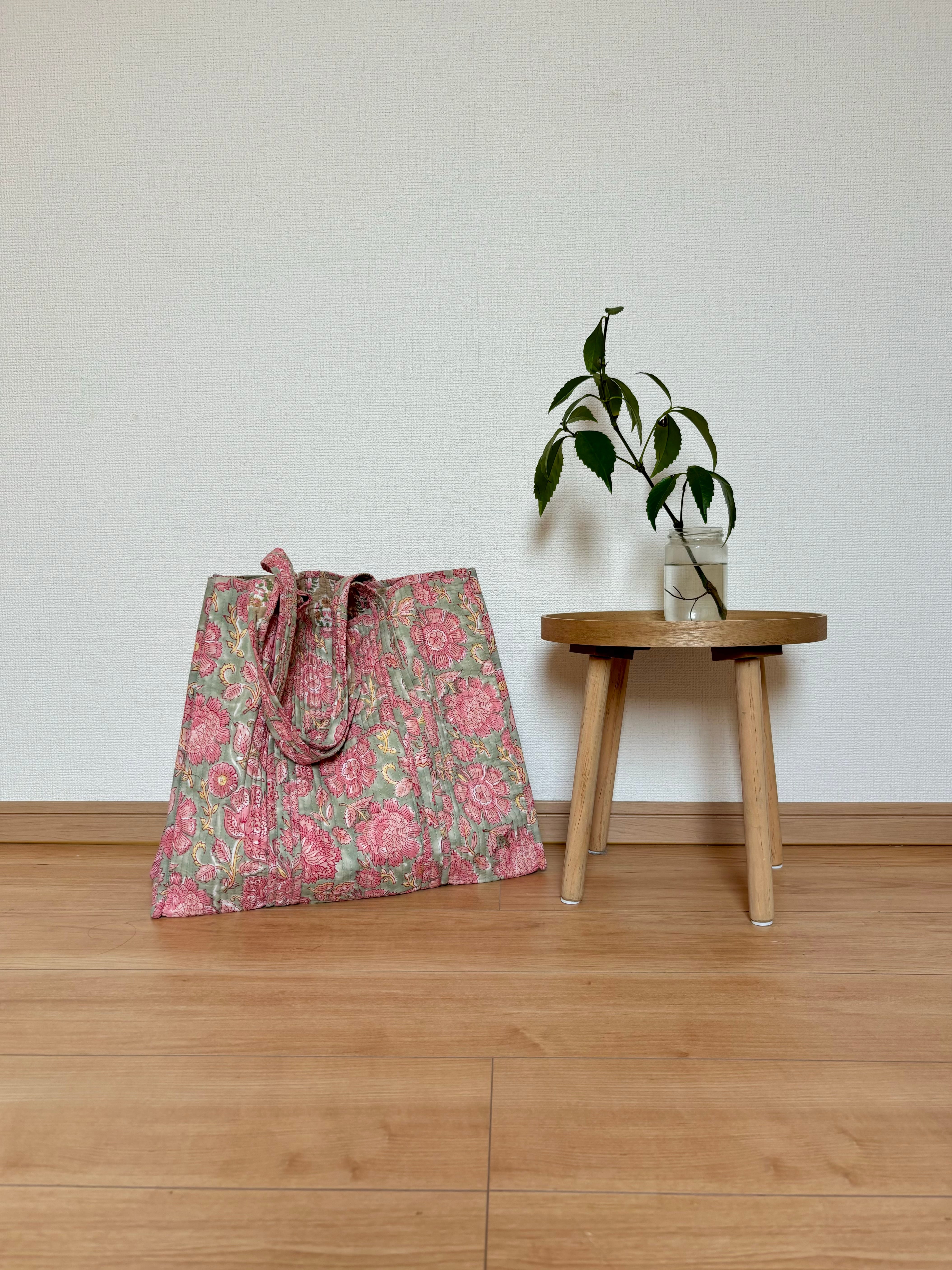 こちらのバッグは、インドの職人が一つ一つ大きなスタンプを押して模様をつけたブロックプリント生地を使用しています。