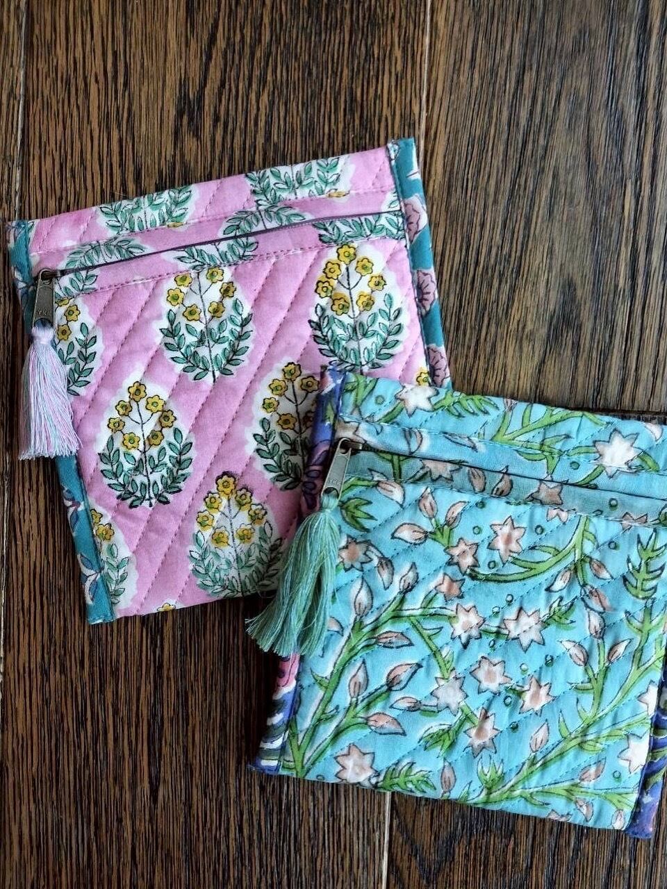 こちらのポーチは、インドの職人が一つ一つ大きなスタンプを押して模様をつけたブロックプリント生地を使用しています。