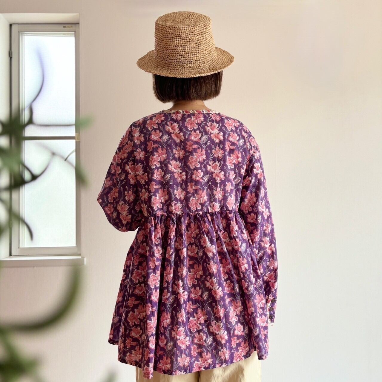 こちらのラバリジャケットは、インドの職人が一つ一つ大きなスタンプを押して模様をつけたブロックプリント生地を贅沢に使用したブラウスです。