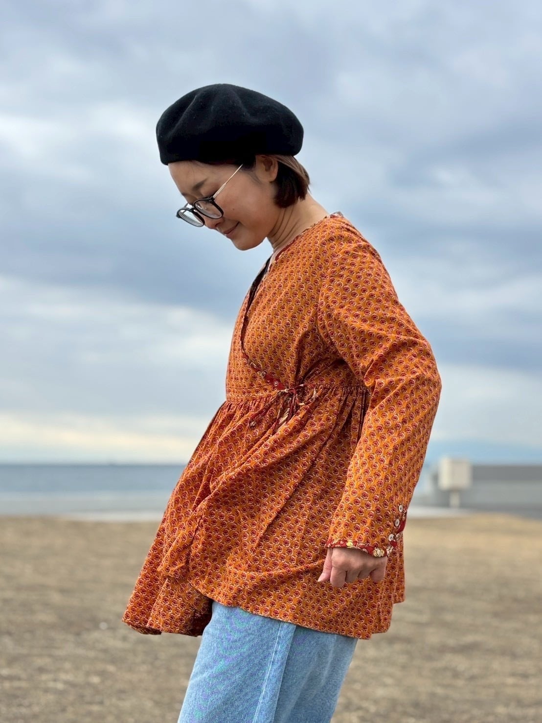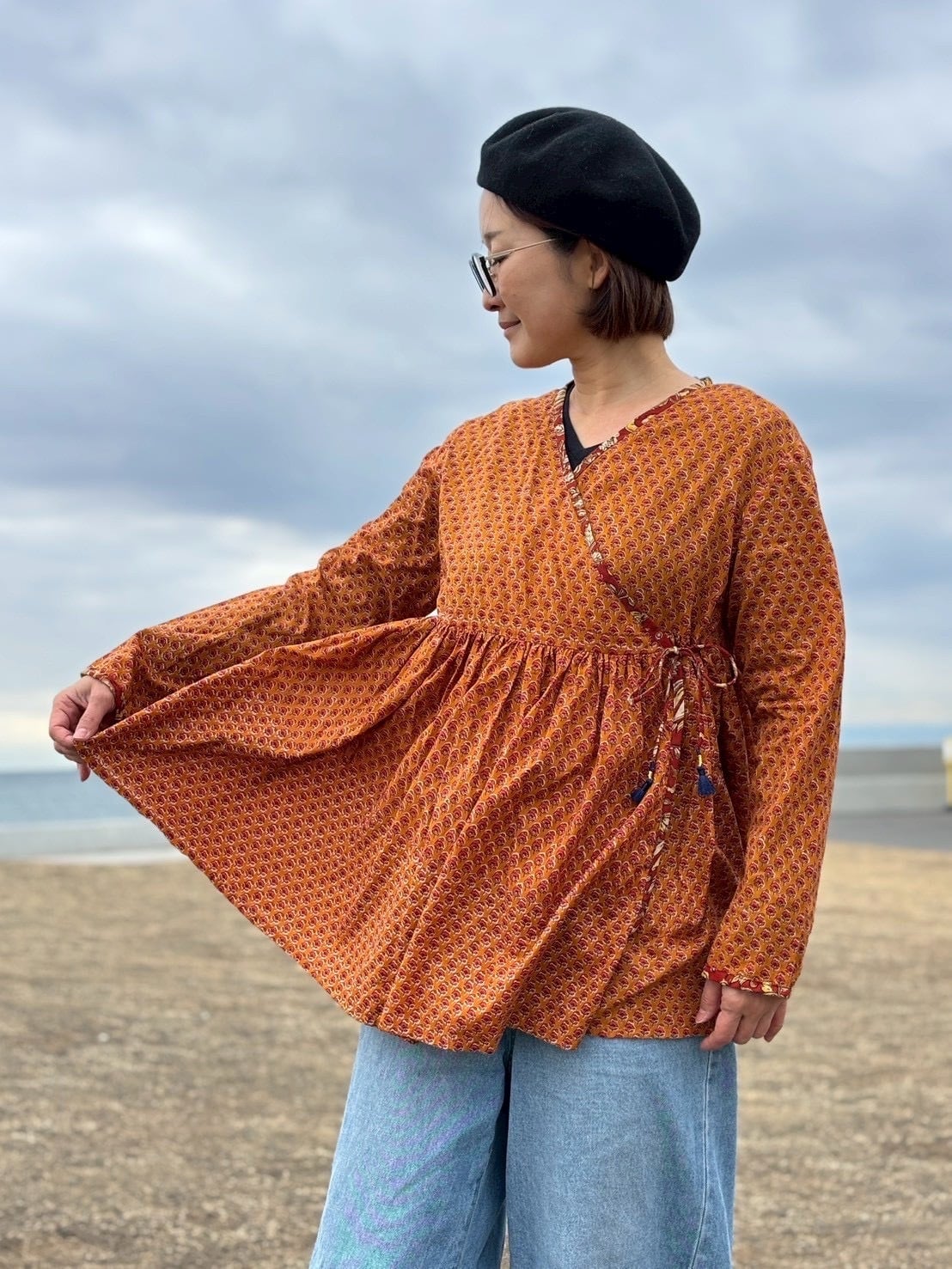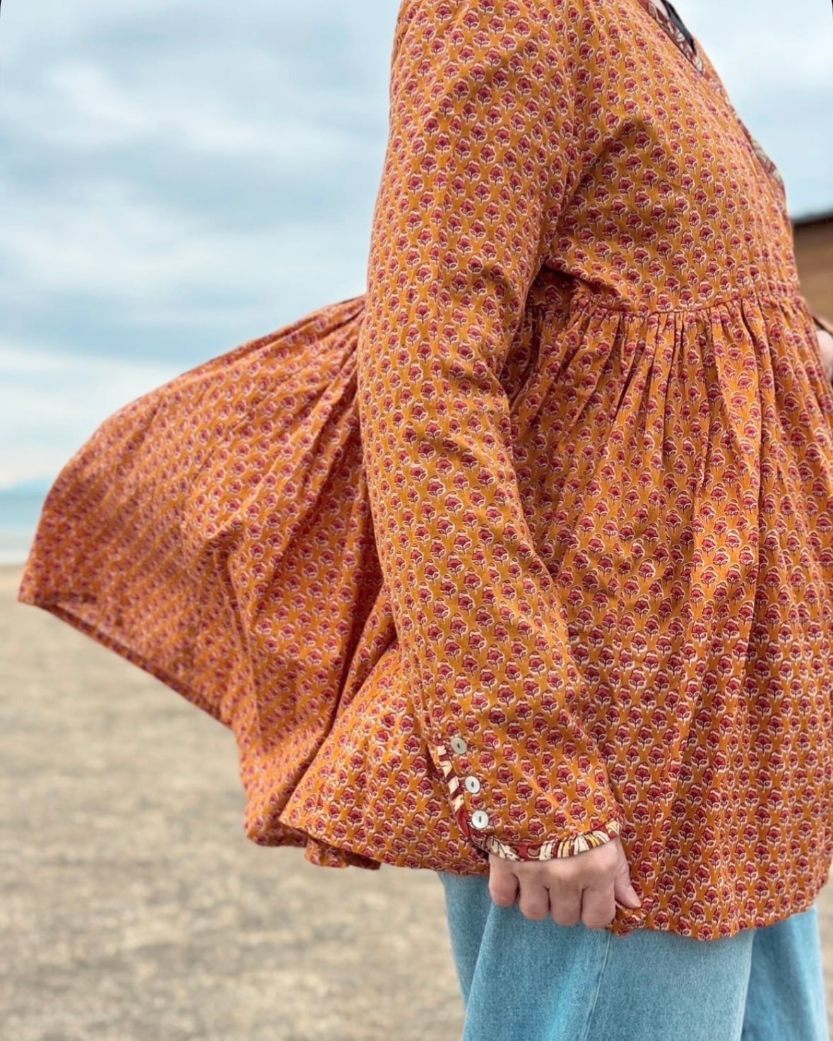 こちらのラバリジャケットは、インドの職人が一つ一つ大きなスタンプを押して模様をつけたブロックプリント生地を贅沢に使用したブラウスです。